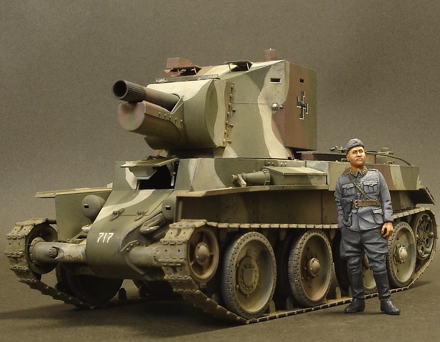 タミヤ 35318 「BT-42」 ソ・フィン戦争で圧倒的多数のソ連軍に大打撃を与え、大量の兵器を鹵獲。その中の「BT-7快速戦車」の車体を利用してフィンランド軍独自に完成させた突撃砲が本車。 しかし、装備された主砲は40年の冬戦争時に急場を凌ぐためイギリスとスペインから入手した旧世代の骨董品的な榴弾砲で、それを強引に納めるべく砲塔は大型化、ソ連の「KV2」のような容姿ではあるものの、貧弱な装甲と徹甲弾を使えない主砲では戦車相手に全くと言っていいほど役に立たなかったようで、1944年のヴィープリ防衛戦で、ソ連戦車に何発も命中弾を浴びせるも撃破できず、それ以降は実戦に使用されないまま終戦となっています。 <キット内容> 懐かしいイースタンのキットはコチラ 先に発売された「BT-7」に新規パーツを組み合わせたもの。 メインとなる砲塔はしっかりとリサーチされ、申し分ない出来。 車両ごとに若干の変化があるOVMの配置も2パターン再現可能です。 コレといって文句の付け所は無いのですが、砲塔後部の大型扉を開くと内部の再現が貧弱なため、インテリア好きな方はいずれ出るであろうアフターパーツを待つしかなさそう。 <追加製作> 砲塔上部前方に二つあるペリスコープの蓋の支持棒?みたいなヤツをプラペーパーで再現。 ワイヤロープのスリーブにはタミヤ恒例の切り込みが入っているので、凧糸を接着してからパテ埋め。 フィギュアはいろいろ改造してます。 <感想> 他のフィンランドAFVはハカリスティデカール貼るだけでOKなので ひとまずこれでフィンランドはコンプリート! <簡易データ> 納入時期:1942秋〜44年夏 総数:18輌 最高速度:53km 乗員:3名 武装:114mm榴弾砲×1 |